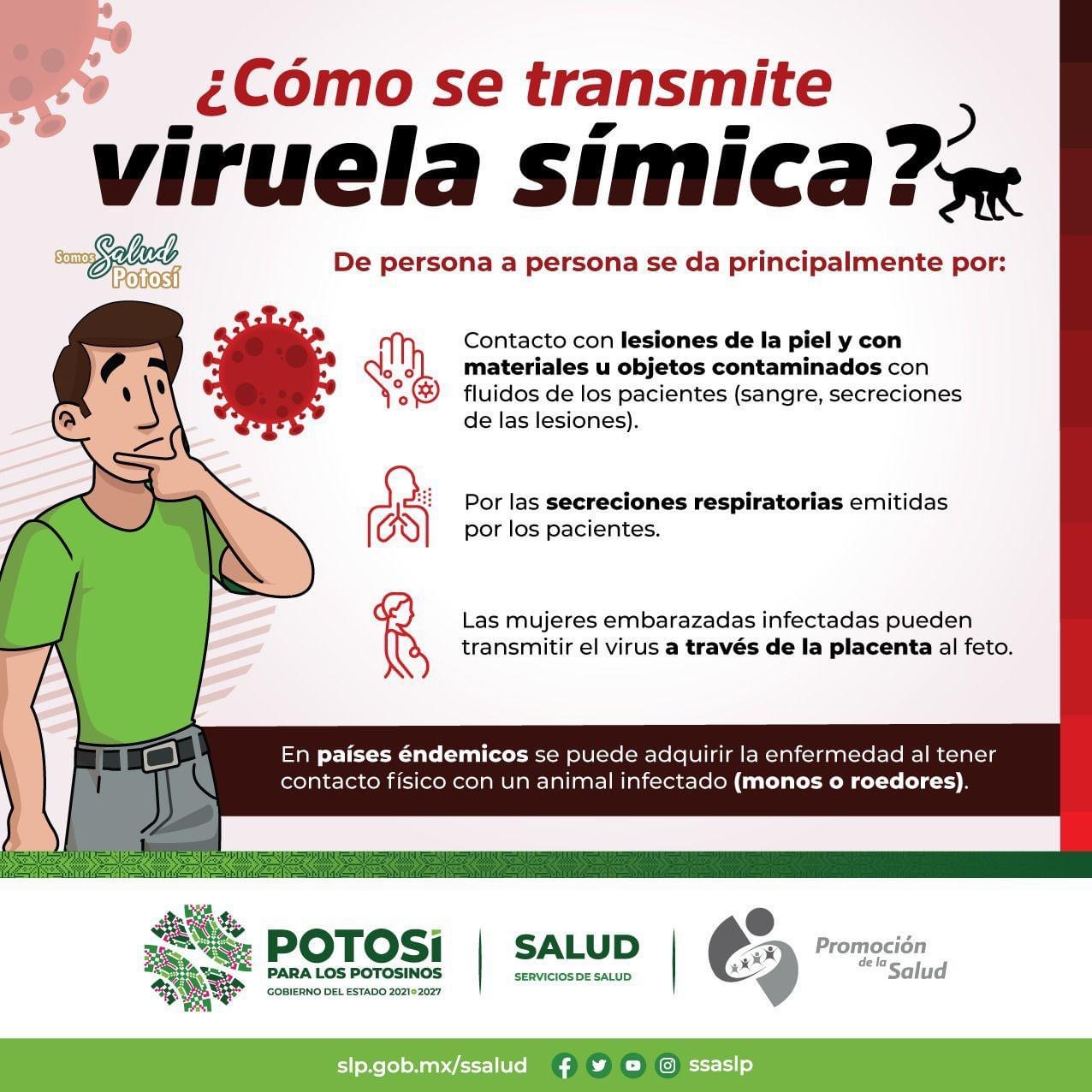 El nuevo caso confirmado corresponde a una persona del sexo masculino residente en la capital potosina y que presenta antecedente de viaje a la ciudad de Monterrey, inició con síntomas el 30 de septiembre presentando dolor de cabeza, malestar general y posteriormente lesiones en la piel, acudiendo a médico particular quién notificó a la Subdirección de Epidemiología de los Servicios de Salud, se tomó muestra que fue enviada al InDRE y se confirmó el resultado positivo a viruela símica.