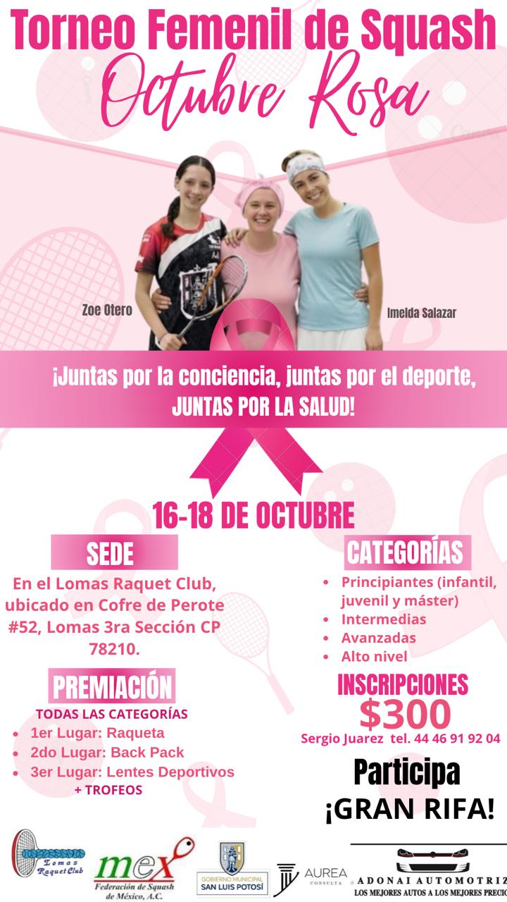 El Octubre Rosa en el squash es posible gracias a la voluntad y compromiso de grandes deportistas potosinas que, desde la cancha, quieren inspirar a todas las mujeres a cuidar de su salud mediante la información y la prevención.Invitación abierta